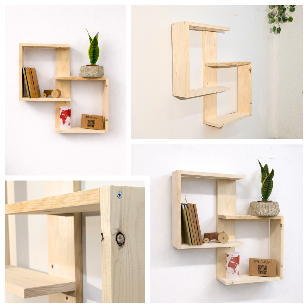 Θα την κατασκευάσουμε από μασίφ ξύλο έλατου. Μια ιδιαίτερη ραφιέρα με τέσσερα επίπεδα για βιβλία, φυτά ή διακοσμητικά αντικείμενα. Ένα πρακτικό και ζεστό κομμάτι που οργανώνει τον χώρο και ταιριάζει εύκολα σε κάθε σπίτι.